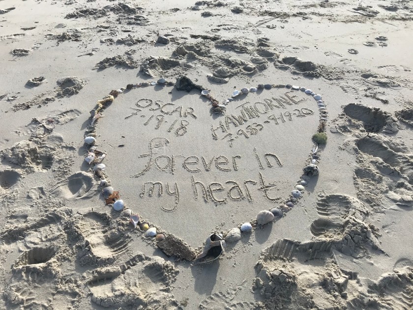 I make my way out of the dune and approach the water at the inlet. Foot and pawprints mar the sand in every direction; there’s a unmarked patch, maybe four feet by four feet, that is untouched. I take the horseshoe crab tail out of the bag and draw a large heart taht ends up a little wonky. It will be washed away with the next high tide, but that’s alright. I kneel and set out piece after piece, shell after shell, sea garbage after beach debris. Seaweed that looks like stacks of coins on a string, scallops and clams, mussels and conches; thick pieces, broken pieces, pockmarked and scarred pieces. I add the delicate leftovers of crabs, pine cones from the tree, a piece of waterlogged cedar shingle. I write Oscar’s name and his date, then yours, and your dates. You always wanted me to write RIP, but I thought it was tacky and too much like a Halloween decoration, so I never did. Instead, I write “forever in my heart,” for you both are. I take some pictures, take some time, then turn to walk toward the car, still slower that I ever had before.