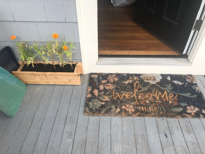 It’s been nearly two weeks since I wrote about the marigolds; they bloom, all six of them now, stems strong and petals thick. They still don’t really look like any in the gardens around me; that’s ok. They don’t need to. I see them, and smile reflexively; I see them and the tension slides out of my shoulders, even when I’m holding Lucy and it seems like all our worldly goods in my arms. Lucy has been gentle with them, as she is with flowers. She touches a fingertip to the petals, exclaiming something that I can only interpret as “Oooh, pretty!” She pats the dirt and looks at her hand, pats it again and gets distracted by wanting to open the mailbox.